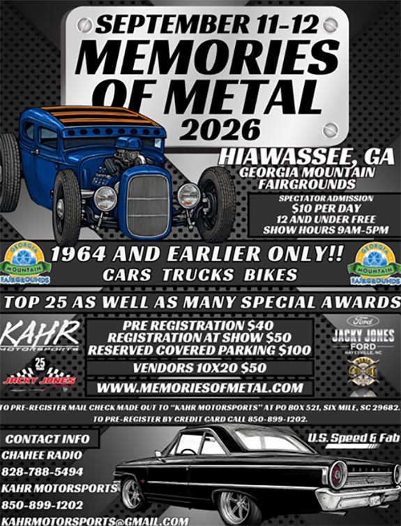 Step back into the golden era of horsepower at Memories of Metal, September 11–12, 2026, in Hiawassee. From polished classics to powerful trucks and timeless bikes, this show is all about honoring automotive history and the stories behind it. Enjoy special awards, Top 25 recognition, vendors, and a laid-back atmosphere where enthusiasts and families can soak in the sights and sounds of true metal memories.